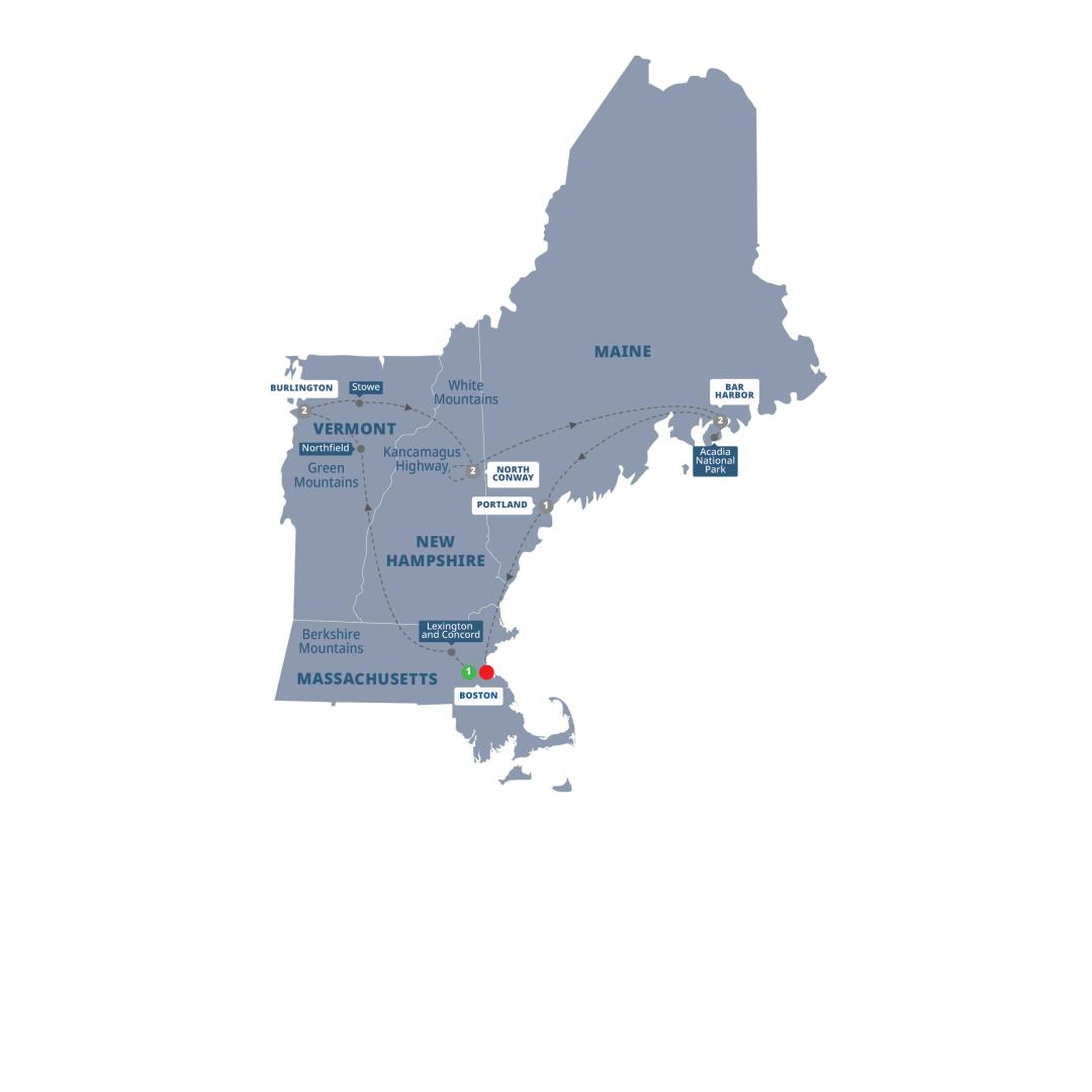 Enjoy a final morning in New England before traveling south towards Boston. On the way, stop at Nubble Lighthouse, one of Maine's most photographed coastal landmarks, for a last look at the Atlantic shoreline. Continue to Boston, where you can transfer to Boston Logan International Airport or to your hotel if you're extending your stay.