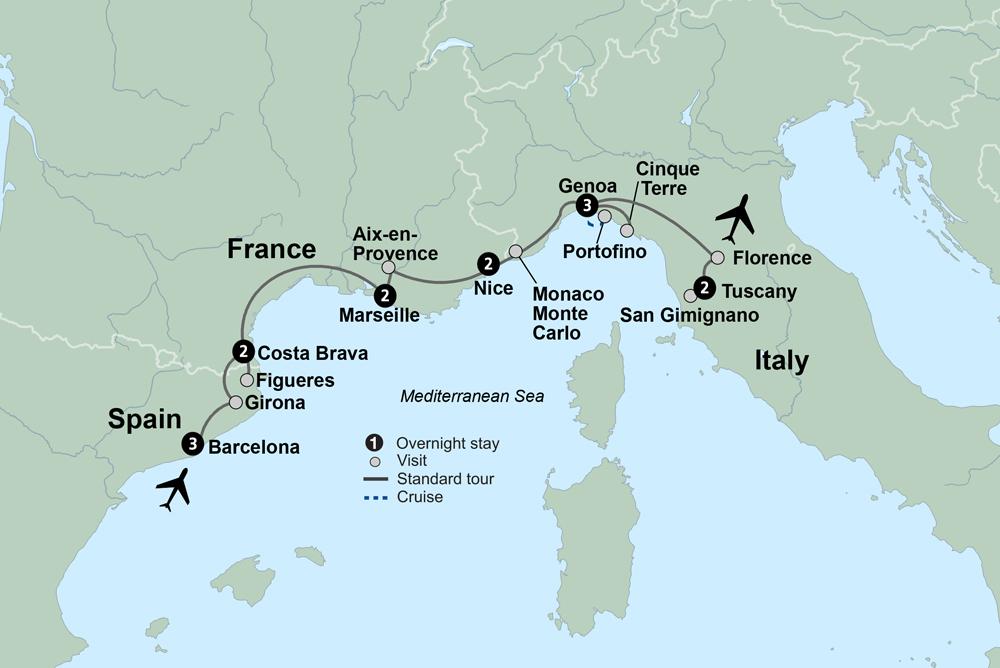 You're on your way to the Mediterranean coast for a journey connecting the Spanish, French and Italian Rivieras. From chameleonic Barcelona to sun-kissed Nice; from glamorous Monaco to the rolling hills of the Chianti countryside, embark on a coastal journey combining rich scenery, art, culture, food, and wine.